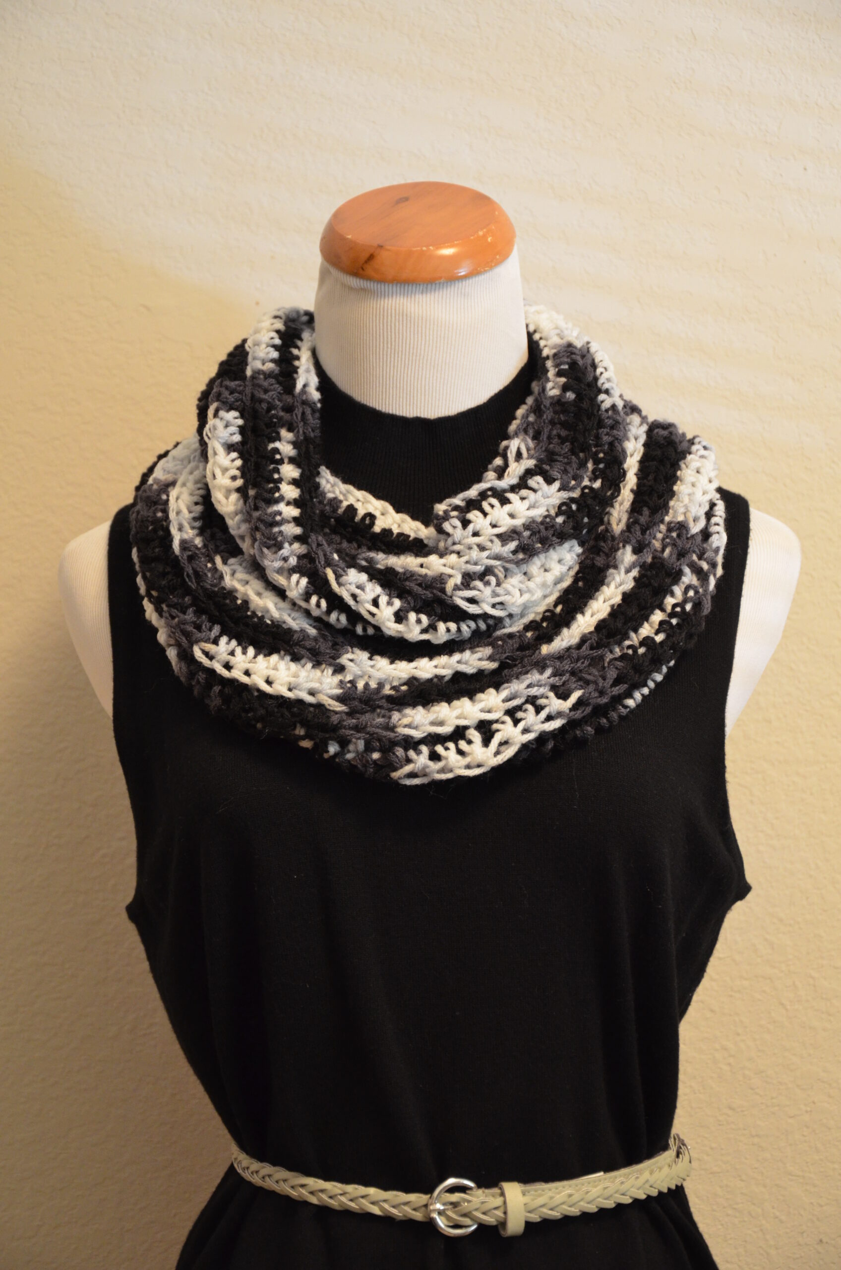 Handmade Infinity Scarf Approximate measurements- Circumference -54″ 27″ long x 6″ wide Fits comfortably doubled around the neck 100% acrylic Machine wash and dry
