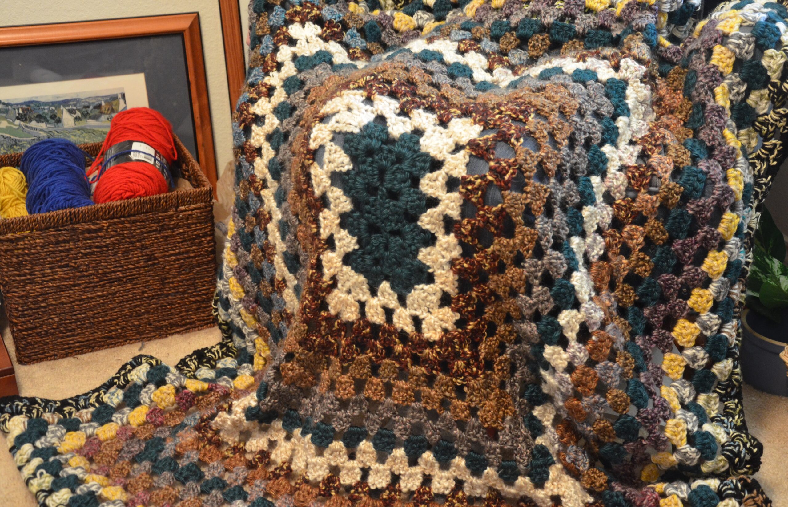This warm and comfy lap blanket is made with 100% Acrylic yarn. It is machine washable and dry. It measures 42″ wide by 56″ long. It is sure to keep the chill off while watching TV, meeting with family and friends, or just relaxing.